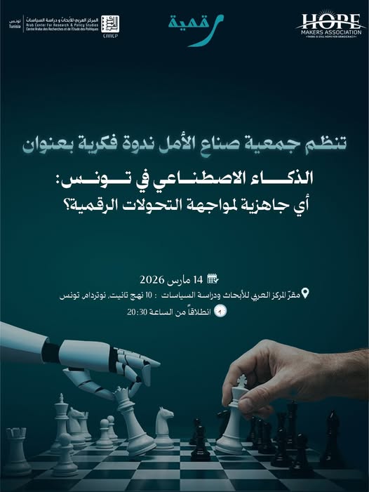 تنظّم جمعية Hope Makers – صُنّاع الأمل بالتعاون مع المركز العربي للأبحاث ودراسة السياسات. تونس ندوة علميّة بعنوان: «الذكاء الاصطناعي في تونس: أيّ جاهزية لمواجهة التحوّلات الرقمية؟»