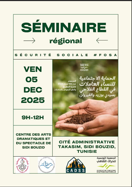 في إطار تفعيل اتفاقيات الشراكة مع المندوبيات الجهوية والمؤسسات والادارات ذات العلاقة، وفي إطار برنامجها الهيكلي لشبكة القيادات النسائية وبالتعاون مع مركز الفنون الدرامية والركحية بسيدي بوزيد، يشرفنا دعوتكم-ن للمشاركة في الندوة الجهوية التي تعتزم الجمعية التونسية للحراك الثقافي تنظيمها حول ” الحماية الاجتماعية للنساء العاملات في القطاع الفلاحي” من أجل توعية وتحسيس العاملات في القطاع الفلاحي بأهمية التشريعات الجديدة المتعلقة بالحماية الاجتماعية على غرار المرسوم عدد 04 سنة 2024 وتقديم مقترحات قصد تطويرها ودعم قابليتها للتنفيذ على أرض الواقع وذلك يوم الجمعة 05 ديسمبر 2025 بمركز الفنون الدرامية والركحية بسيدي بوزيد انطلاقا من الساعة التاسعة صباحا.