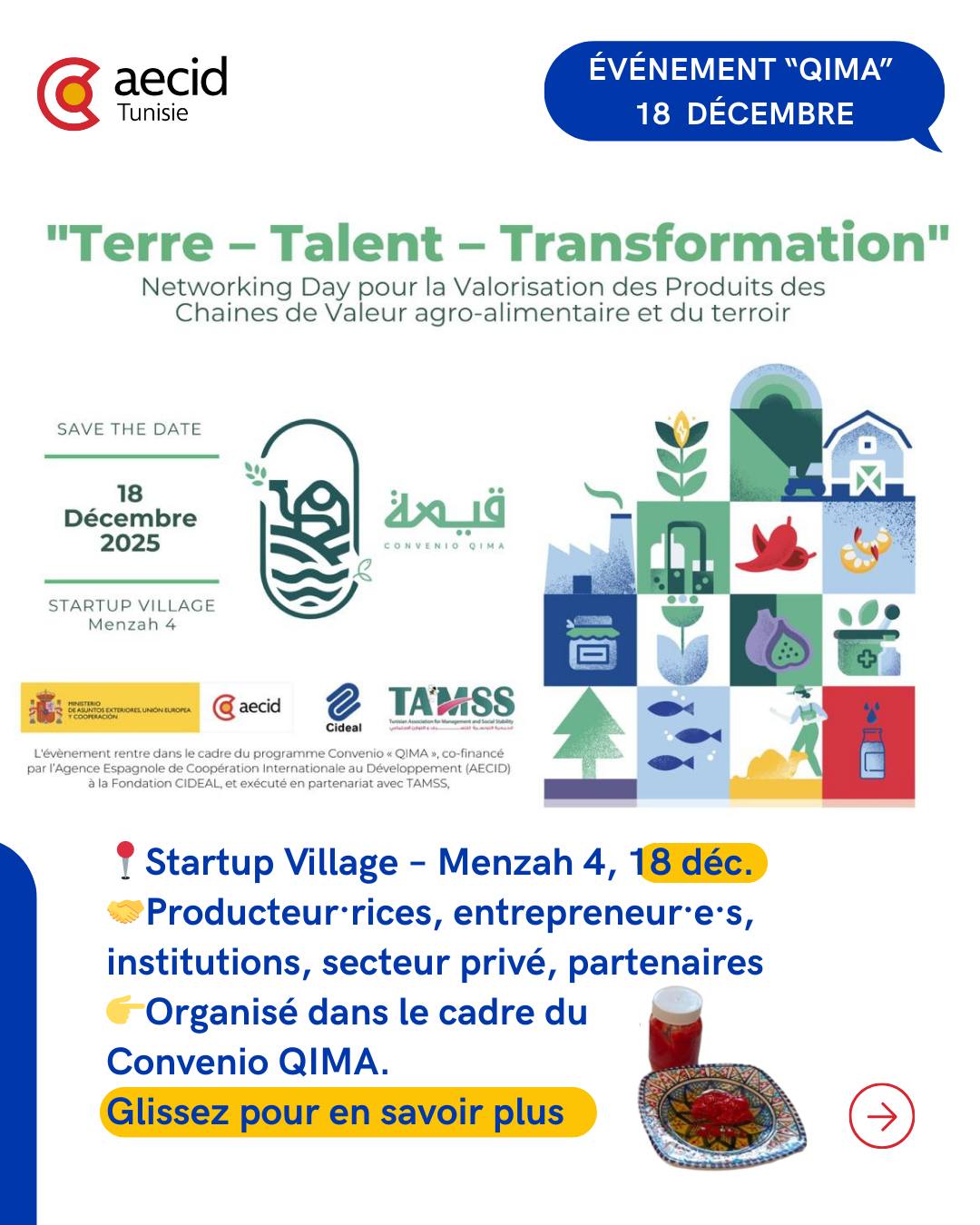Dans le cadre de la Convention QIMA, la Coopération espagnole – AECID vous invite à participer à cet événement organisé par CIDEAL : le Networking Day « Terre – Talent – Transformation », un espace de rencontre dédié à la valorisation des produits des chaînes de valeur agro-alimentaires et du terroir.