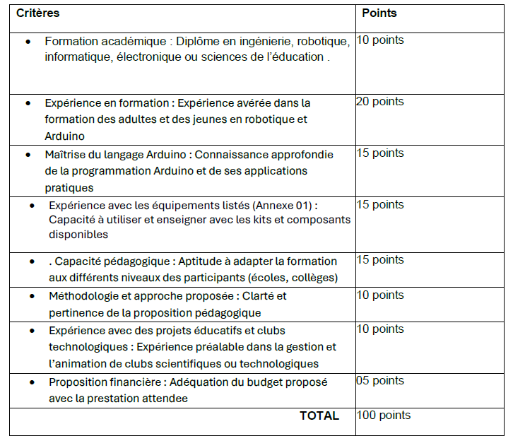 établissements éducatifs ciblés. Elle contribue également à promouvoir la culture scientifique, la créativité, et l’esprit d’innovation chez les jeunes de la région de Siliana. La formation portera principalement sur le langage Arduino et l’exploitation des équipements mentionnés dans l’Annexe 01.