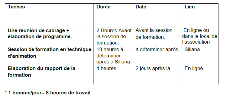 Les interventions du formateur.rice auront lieu en présentiel ou à distance. Le formateur.rice sera rémunéré.e en homme/jours ou en heures de travail (1 homme/jour= 8 heures de travail), en respectant le budget alloué à cette activité.