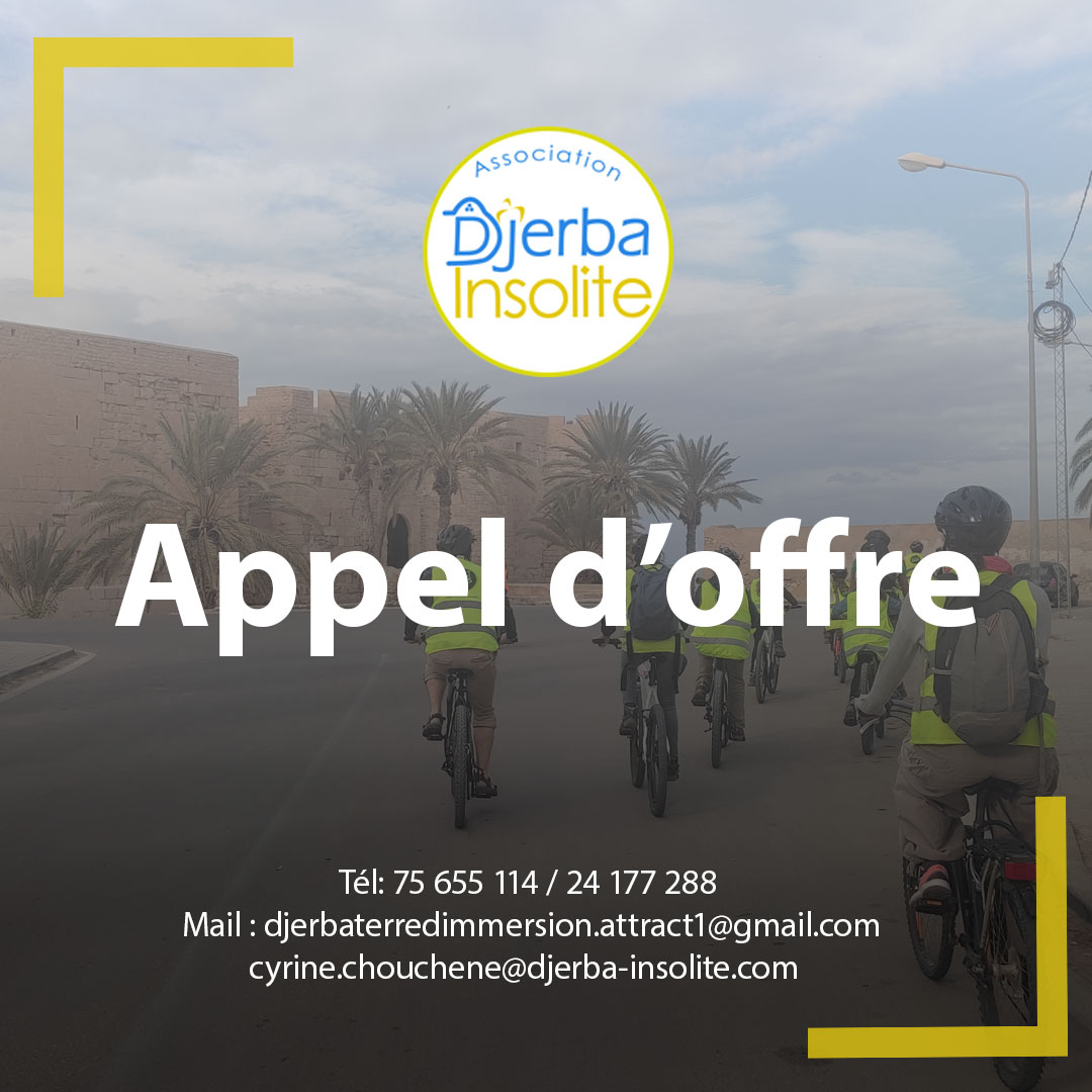 Vos propositions doivent êtres communiqués sur l’adresse : djerbaterredimmersion.attract1@gmail.com en copiant : cyrine.chouchene@djerba-insolite.com avec l’objet : Appel d’offre 2026 / Djerba Insolite.