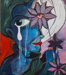 Artist Maha Abdelli, originally from the region, presents a symbolic visual artwork representing a human face between pain and hope. Through tears and flowers, she expresses both environmental degradation and the resilience of nature.